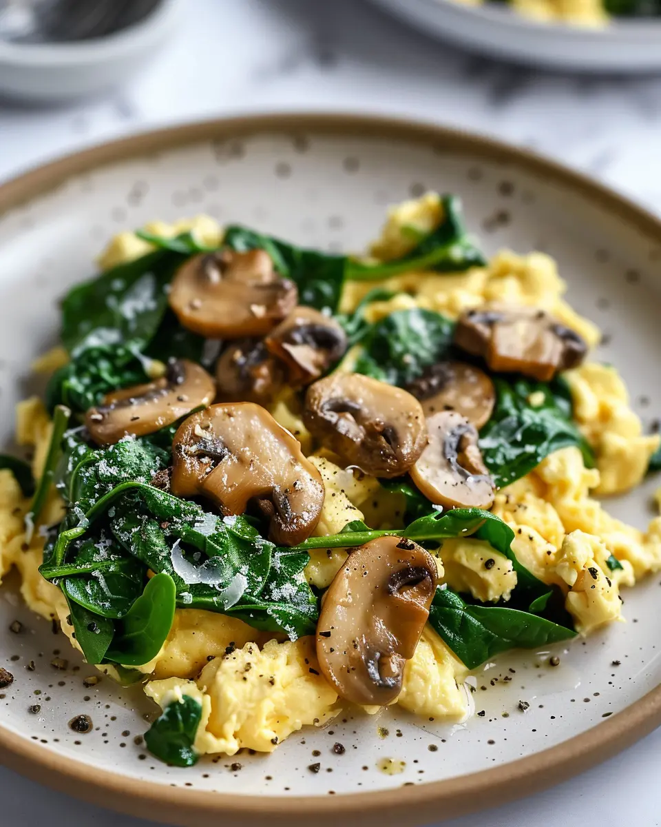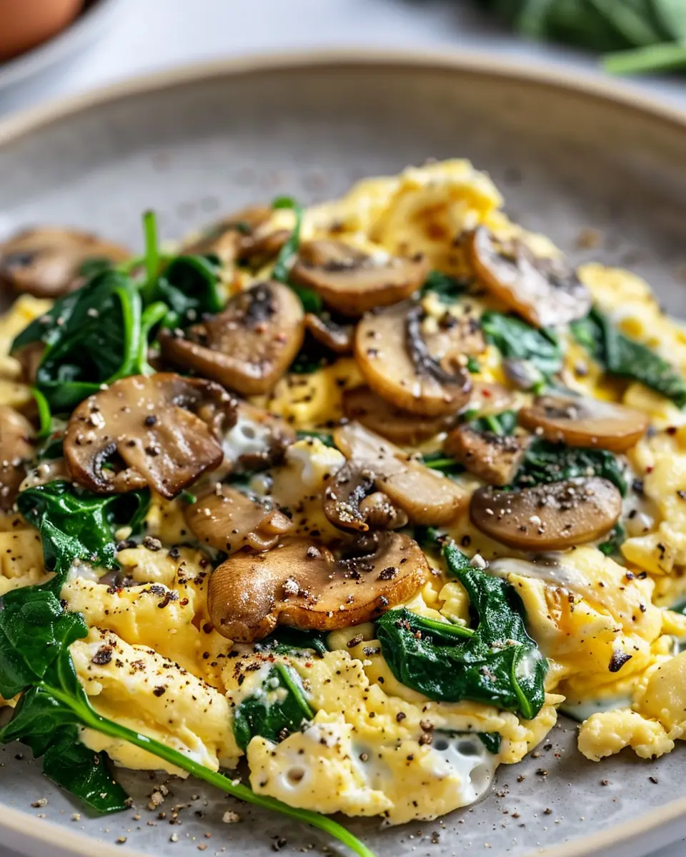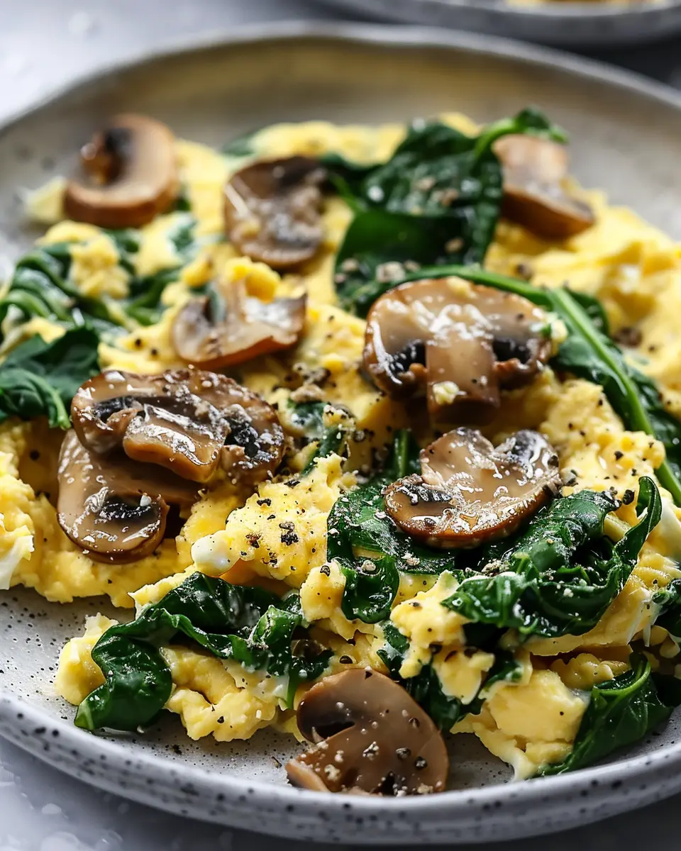 This quick and easy recipe for mushroom spinach scrambled eggs is packed with protein, making it a perfect breakfast option.