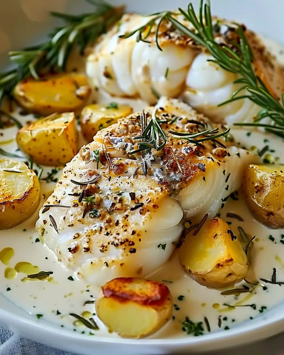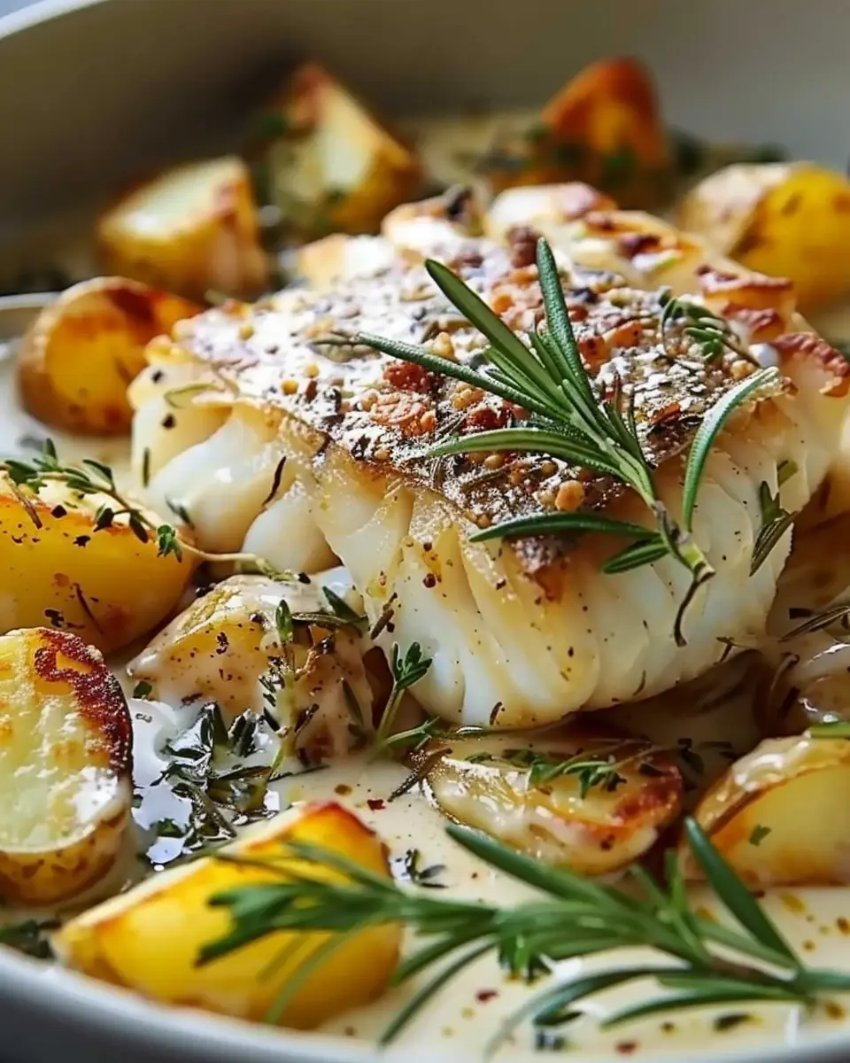 A delicious combination of cod and potatoes smothered in a rich rosemary cream sauce, perfect for a delightful dinner.