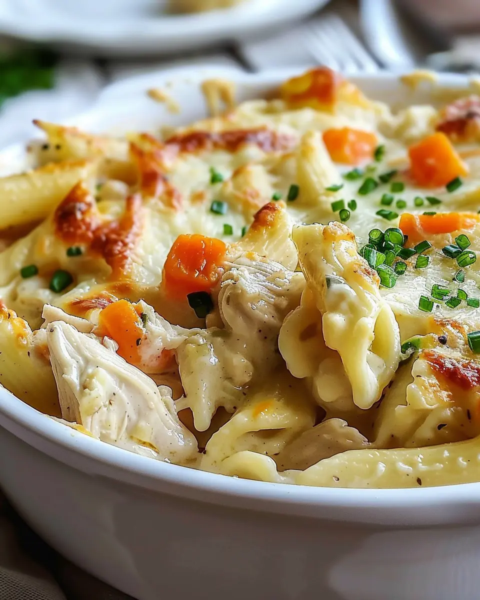 A delicious and comforting dish that combines the flavors of chicken pot pie with pasta for a perfect meal.