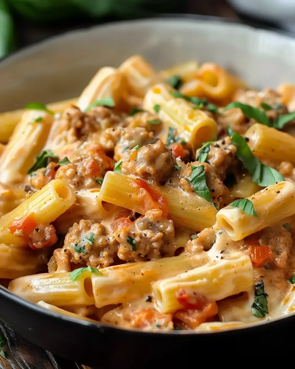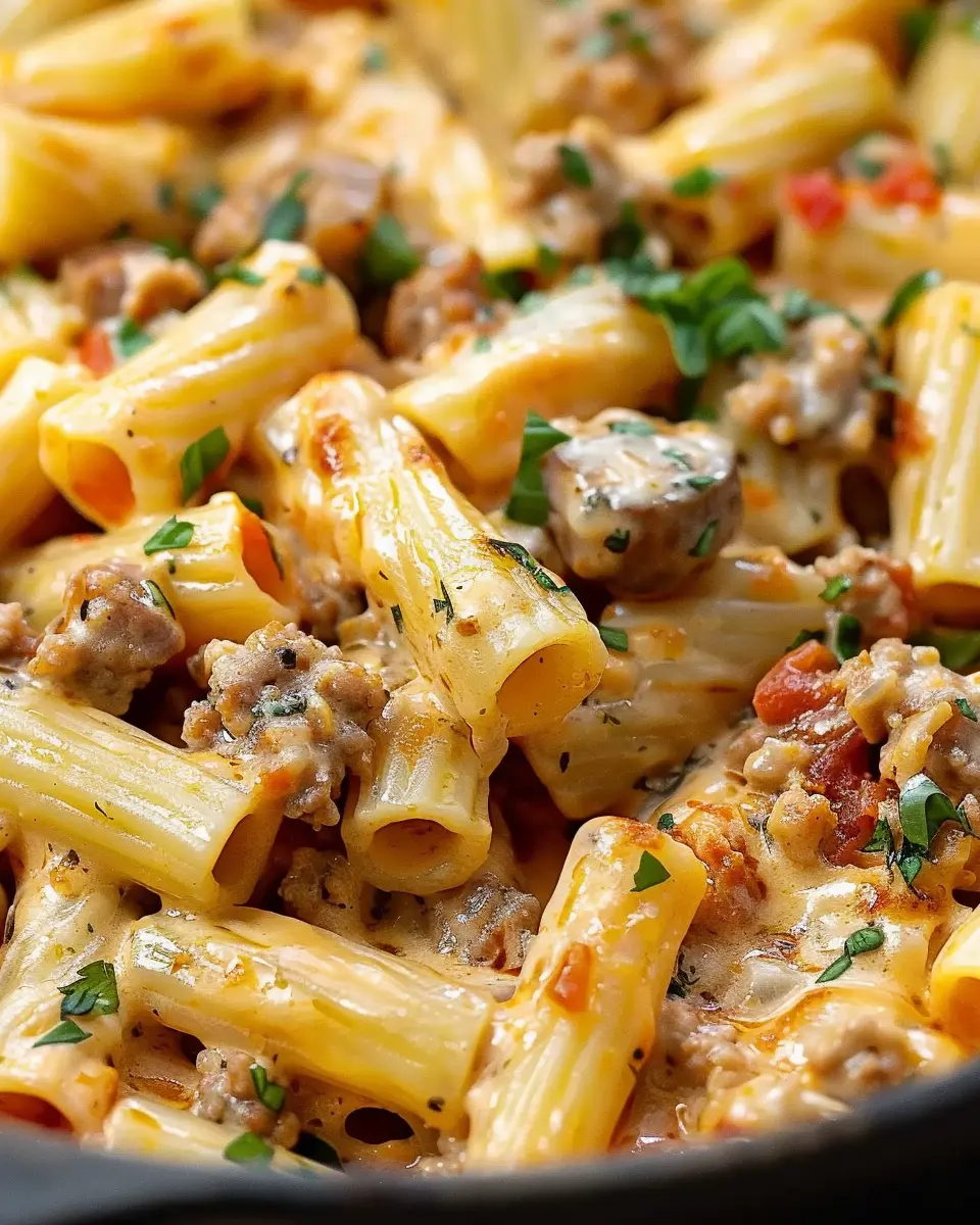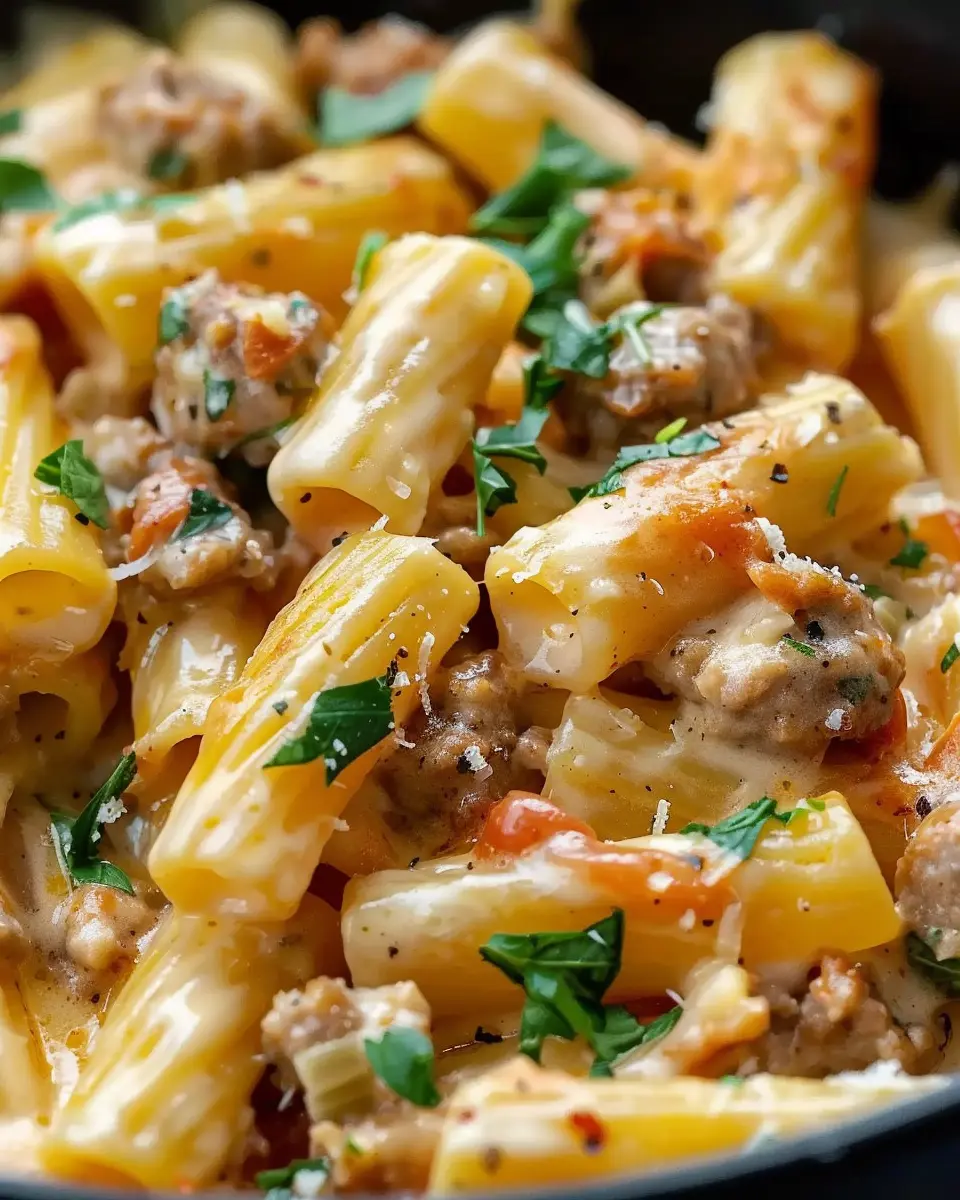 A creamy and flavorful dish made with rigatoni pasta and Italian sausage, perfect for family meals.