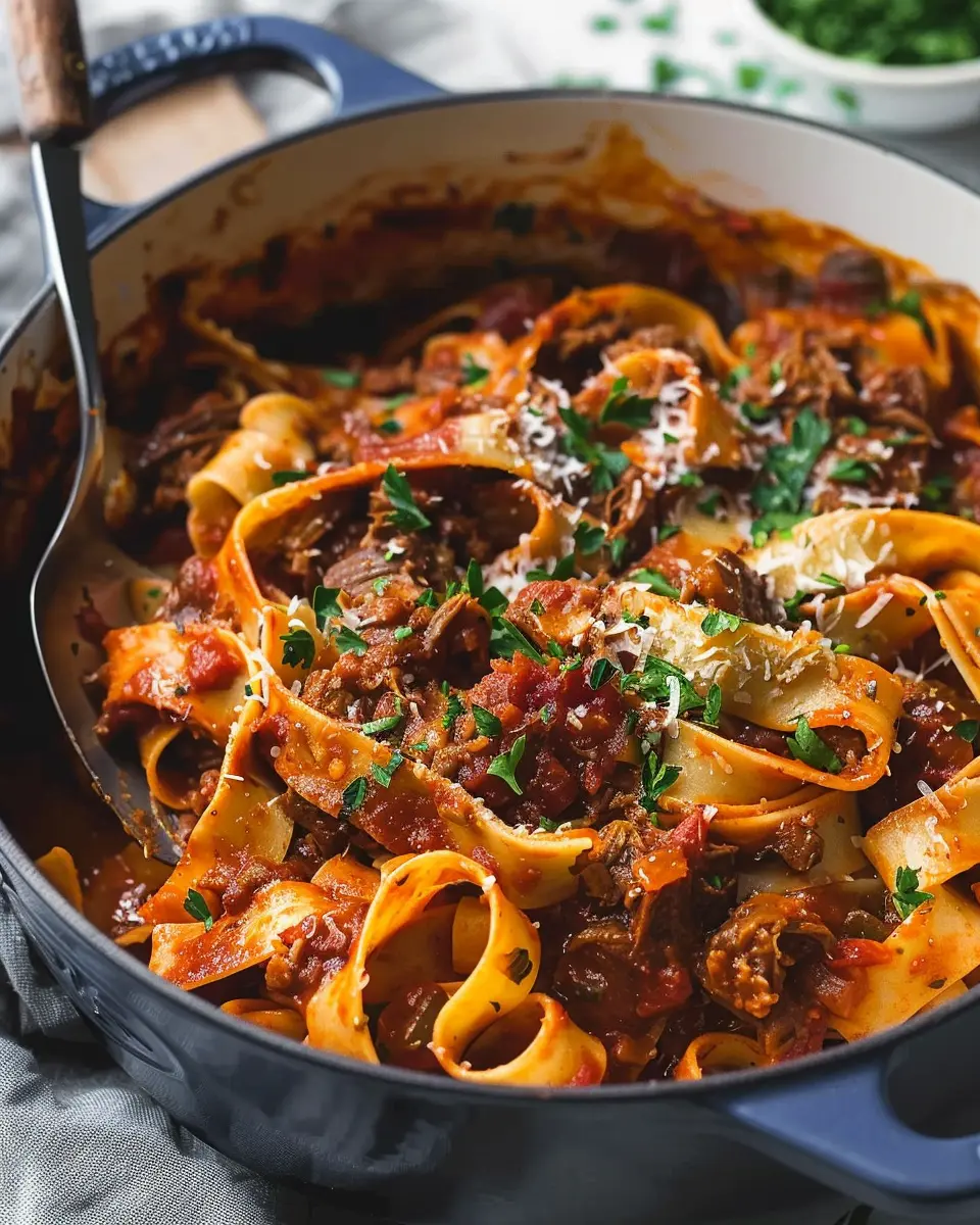 • Toss the pasta: Add the cooked pappardelle directly into the Dutch oven and gently stir to coat the pasta in that luscious ragu.