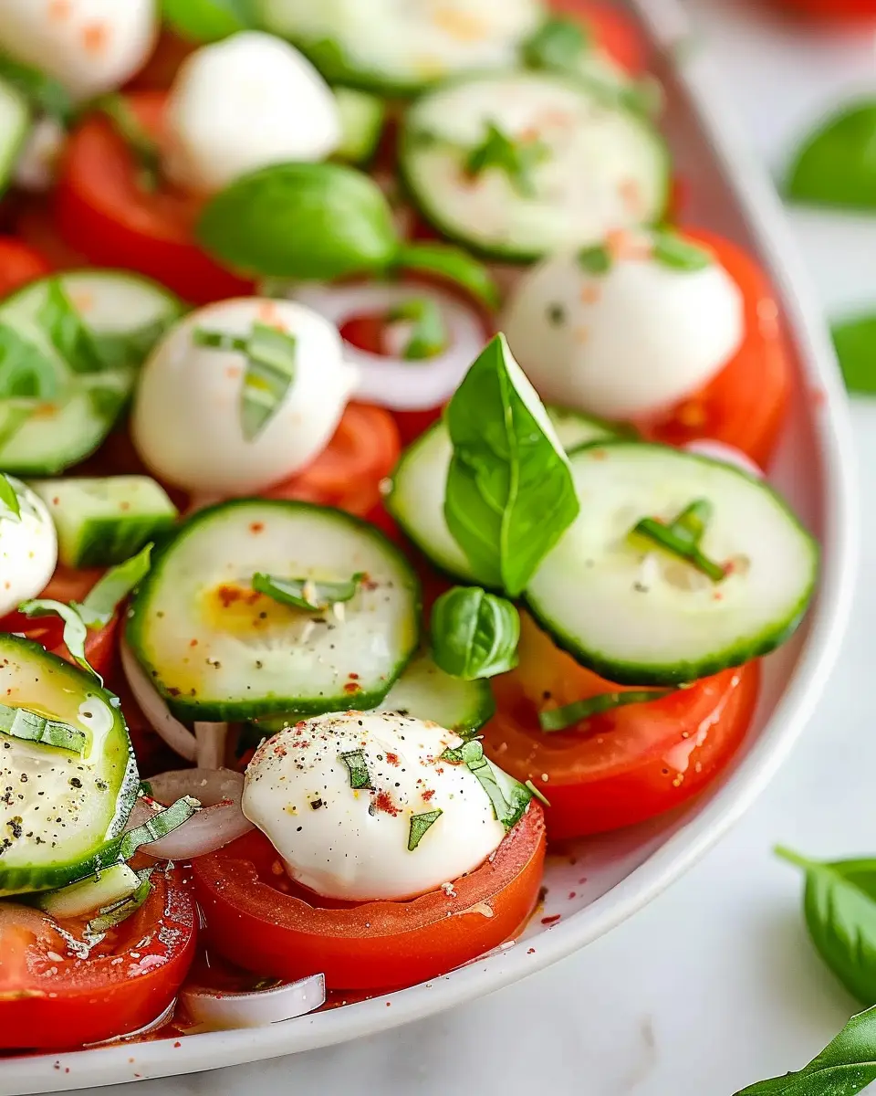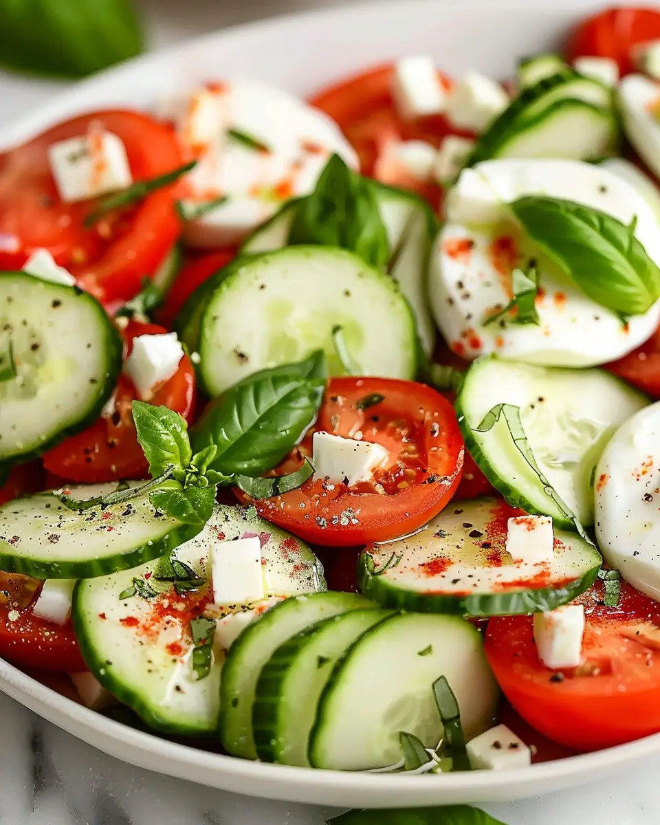 Once your ingredients are ready, assembly takes less than 10 minutes. Simply layer the cucumbers, mozzarella, and basil, then drizzle with a light olive oil and balsamic reduction. Voila! Your fresh and vibrant salad is ready to impress.