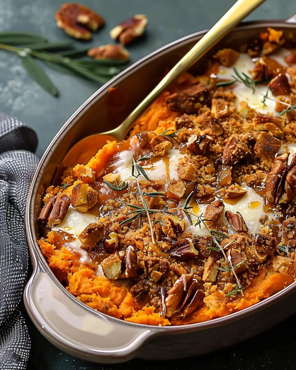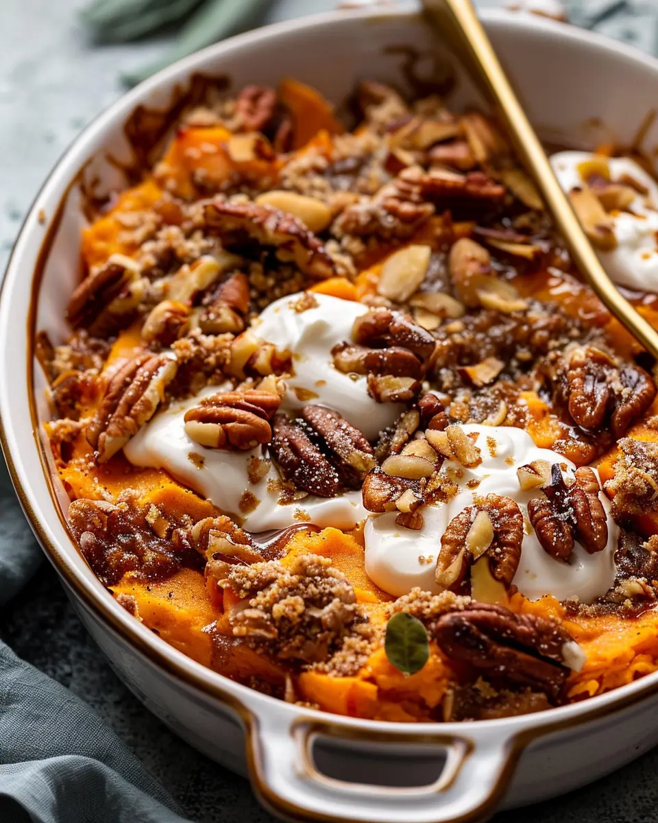 A deliciously indulgent dish featuring sweet potatoes and the richness of turkey bacon, perfect for holiday gatherings.