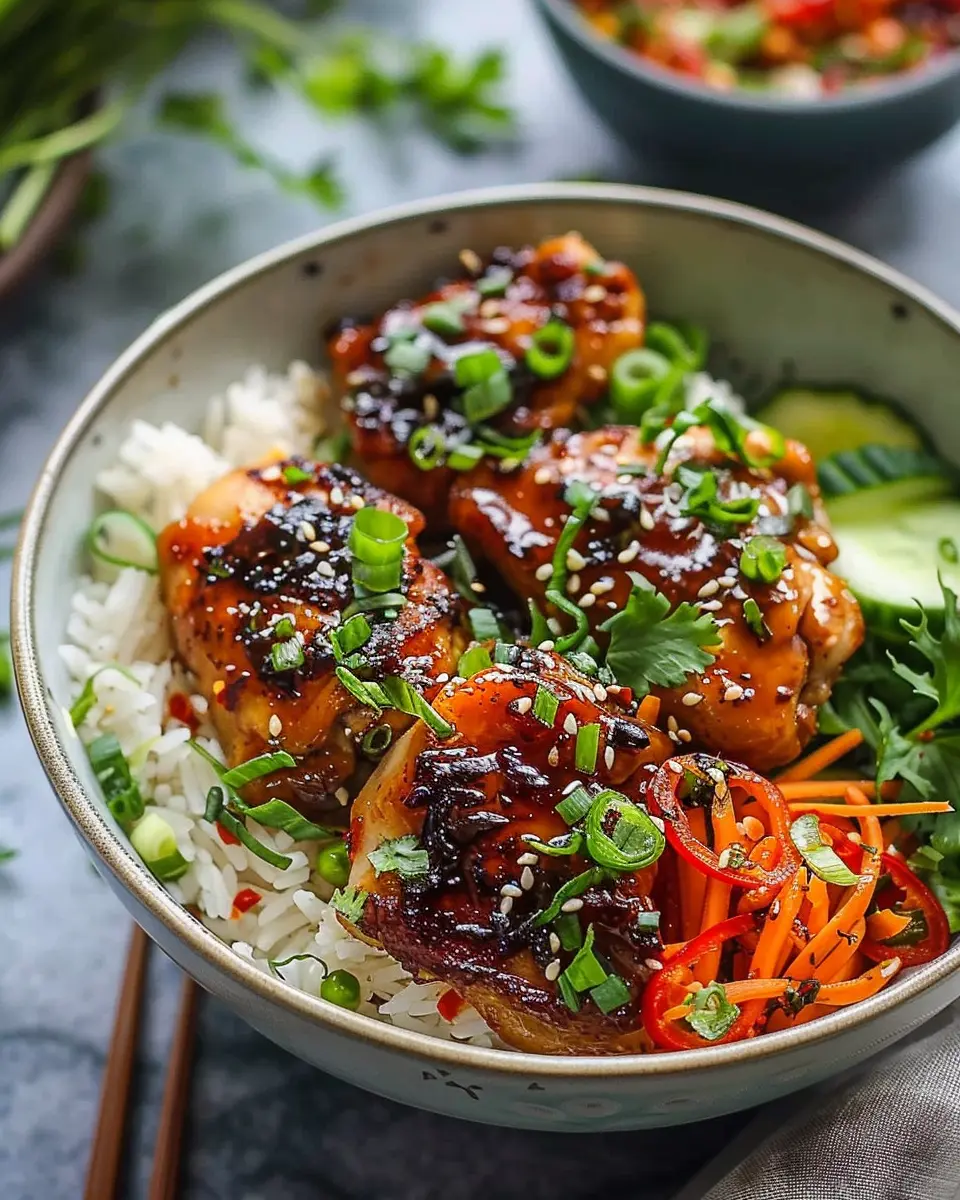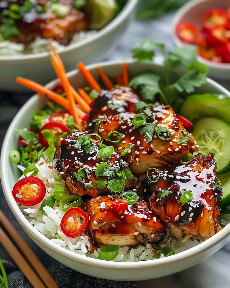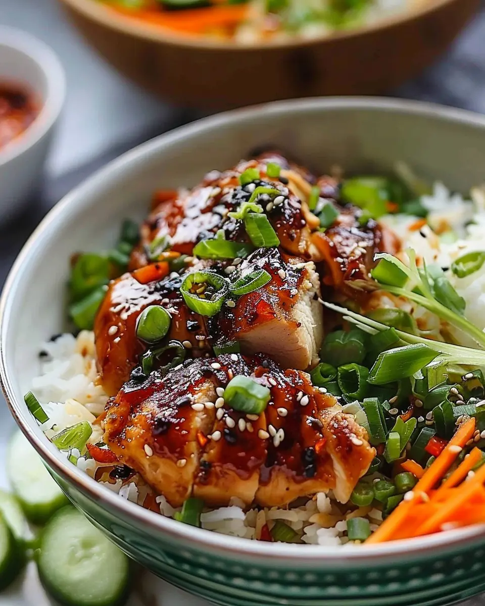 And there you have it! Your Sweet Chili Chicken Rice Bowls are ready to be enjoyed. The combination of flavors and textures—from tender, glazed chicken to the crunch of fresh veggies—ensures that each bite is an absolute delight. Enjoy your delicious creation and don’t forget to share your bowl with friends—after all, good food is meant to be shared!